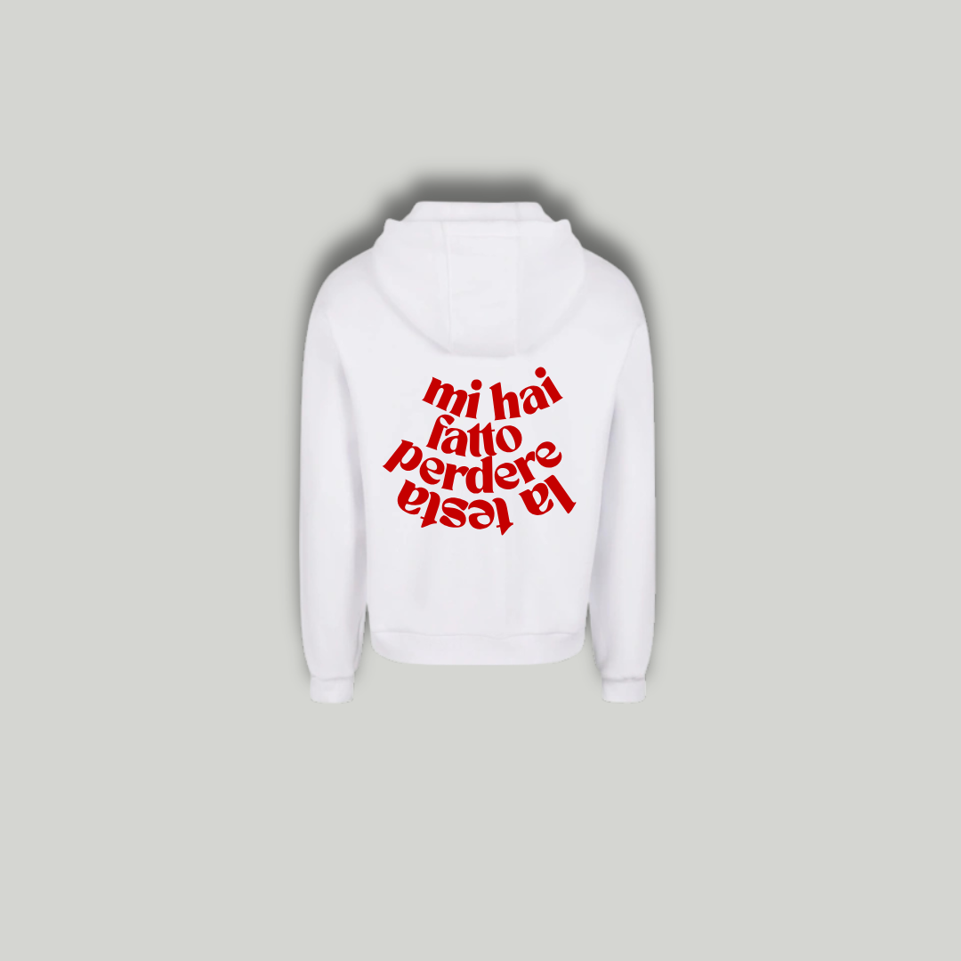 La felpa “Mi Hai Fatto Perdere la Testa” è per chi vive le emozioni senza freni, per chi si lascia travolgere da sguardi, momenti e battiti che accelerano senza preavviso.