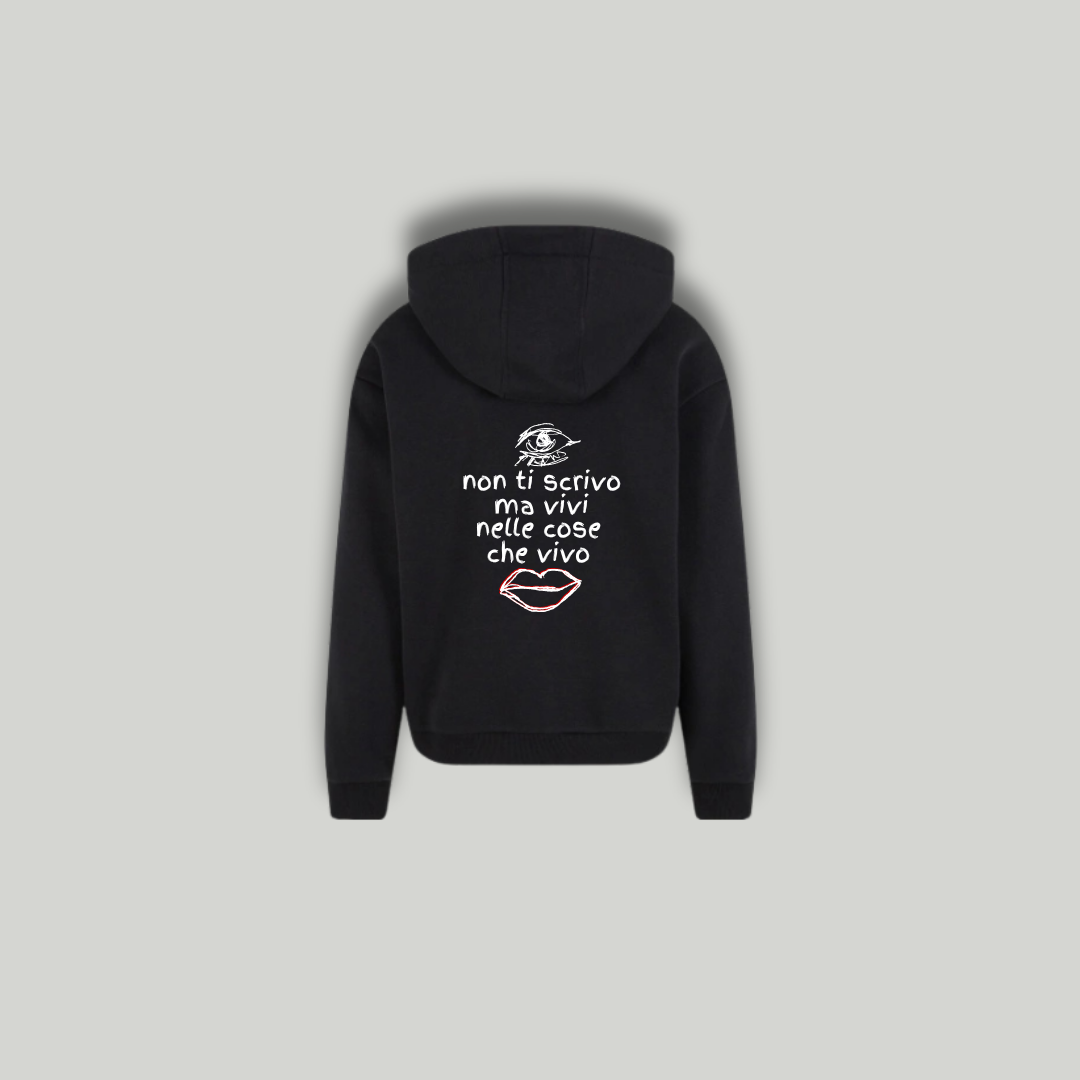 Felpa Nera “Non ti scrivo ma vivi nelle cose che vivo” – 100% cotone, 290g.